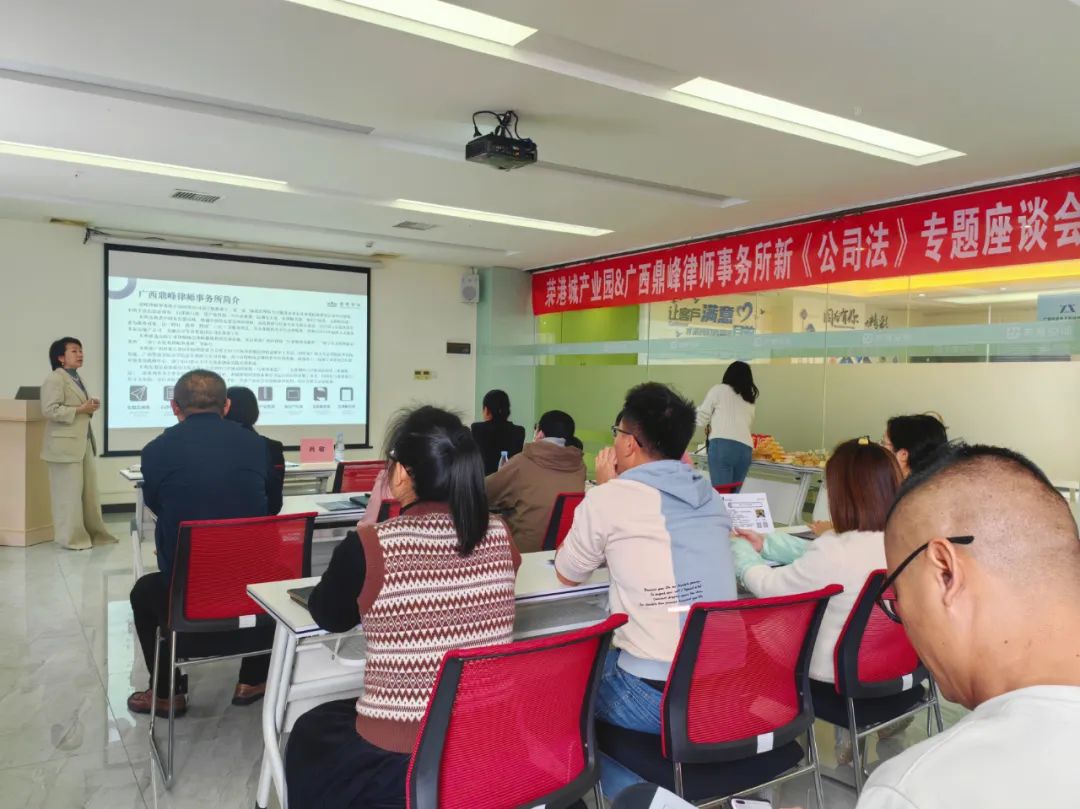為加強(qiáng)園區(qū)企業(yè)法治建設(shè),進(jìn)一步提高企業(yè)風(fēng)險(xiǎn)防范能力,3月21日,榮港城產(chǎn)業(yè)園聯(lián)合廣西鼎峰律師事務(wù)所開展新《公司法》專題座談會(huì),共同深入學(xué)習(xí)新《公司法》熱點(diǎn)關(guān)注問題,提高企業(yè)員工對新《公司法》的認(rèn)知和理解,助力園區(qū)企業(yè)高質(zhì)量發(fā)展。廣西典冠生物科技有限公司、廣西東亨科技有限公司、廣西浩創(chuàng)生物科技有限公司等10多家園區(qū)企業(yè)代表參加學(xué)習(xí)座談。