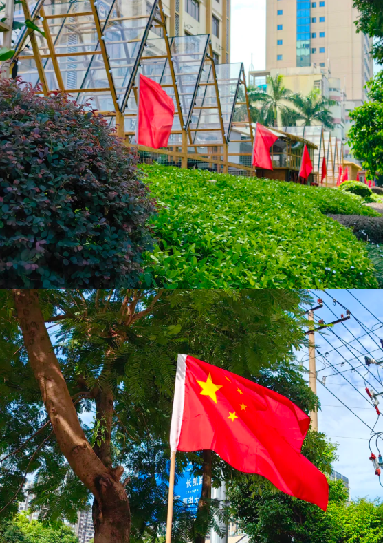園區(qū)綠化帶旁,一面面嶄新的紅旗迎風(fēng)舒展,鮮紅的旗幟與翠綠的綠植相映成趣,紅綢漫卷間形成一道靚麗的 “紅色風(fēng)景線”。莊重?zé)崃业姆諊鷵涿娑鴣?,瞬間點(diǎn)燃心中的愛國(guó)情懷與節(jié)日喜悅。